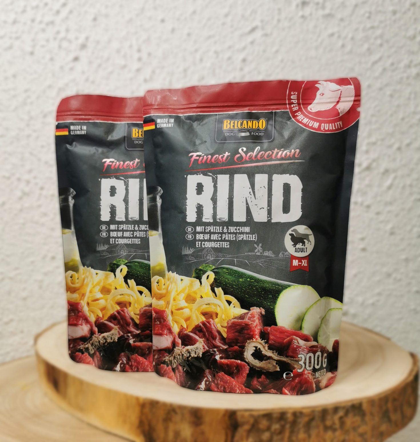Composition: bœuf (viande, foie, panse, poumon, cœur) (63 %); bouillon de viande de bœuf (27,5 %); spätzle, cuit (4 %); courgettes (4 %); huile de carthame (0,5 %); coquilles d’œufs séchées (0,5 %); substances minérales (0,5 %).